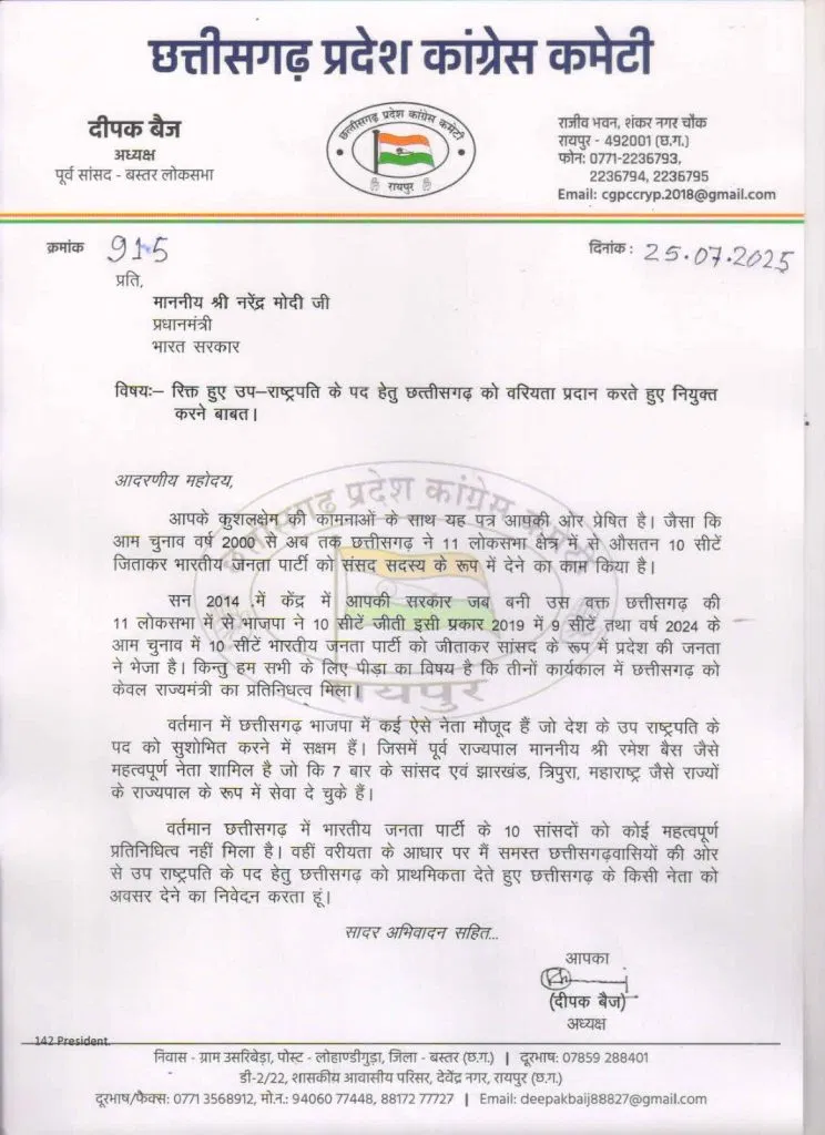 रायपुर। उपराष्ट्रपति जगदीप धनखड़ के इस्तीफे के बाद अब नए उपराष्ट्रपति के चुनाव की तैयारी तेज हो गई है। इस बीच छत्तीसगढ़ पीसीसी चीफ दीपक बैज ने प्रधानमंत्री नरेंद्र मोदी को पत्र लिखा है। पत्र में उन्होंने छत्तीसगढ़ वरिष्ठ बीजेपी नेता और पूर्व राज्यपाल रमेश बेस को उपराष्ट्रपति बनाने की मांग की है।