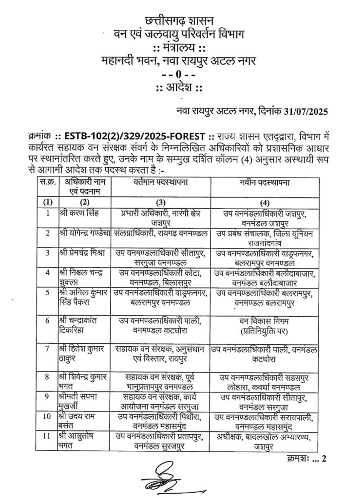 रायपुर । राज्य सरकार ने सहायक वन संरक्षक संवर्ग (Assistant Forest Conservator) के अधिकारियों और वनक्षेत्रपालों का ट्रांसफर कर दिया है। इस संबंध में वन एवं जलवायु परिवर्तन विभाग ने आदेश जारी किया है