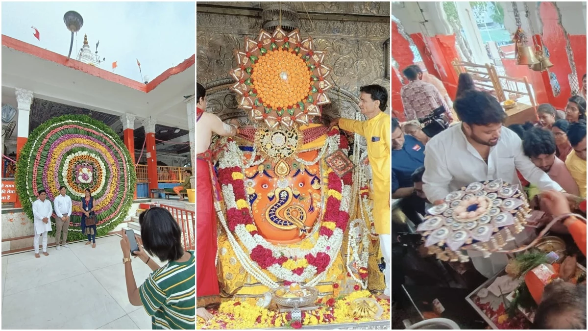 इंदौर। इंदौर (Indore) के खजराना गणेश मंदिर (Khajrana Ganesh Temple) में 196 वर्गफीट की सबसे बड़ी राखी बंधी। इस राखी को कोलकता के कारिगरों ने तैयार किया है। भक्त जनमाष्टमी तक इस राखी को देख सकेंगे। शुभ मुर्हत में वैदिक मंत्रोच्चार के बीच इस राखी को खजराना गणेश को बांधा गया। इस राखी को अलग-अलग शहरों से मंगाए फूलों से कलाकारों ने रात भर जागकर तैयार किया। इसके अलावा पालरेचा परिवार ने भी रुद्राक्ष, सुपारी, लौंग, इलाइची, चांदी सोना वर्क सहित स्वदेशी वस्तुओं का इस्तेमाल कर एक राखी बनाई। उसे भी खजराना गणेश को अर्पित किया गया।