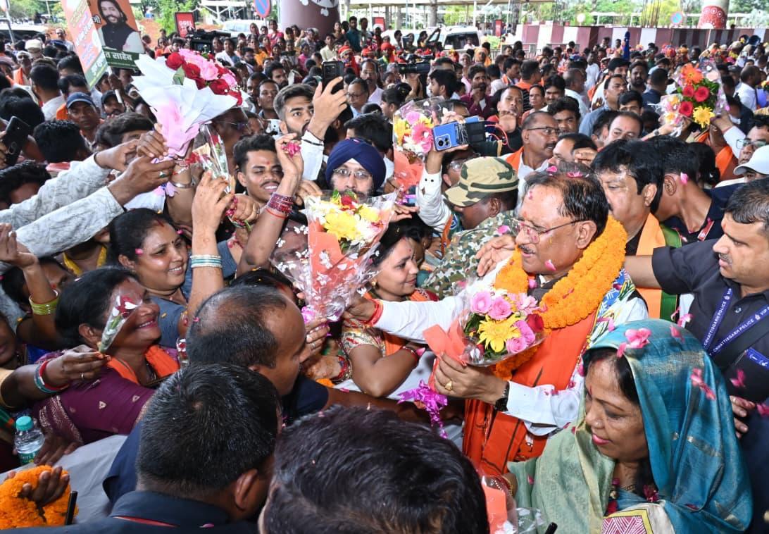एयरपोर्ट पर हुआ भव्य स्वागत, कर्मा-पंथी नृत्यों से सराबोर रहा एयरपोर्ट परिसर
