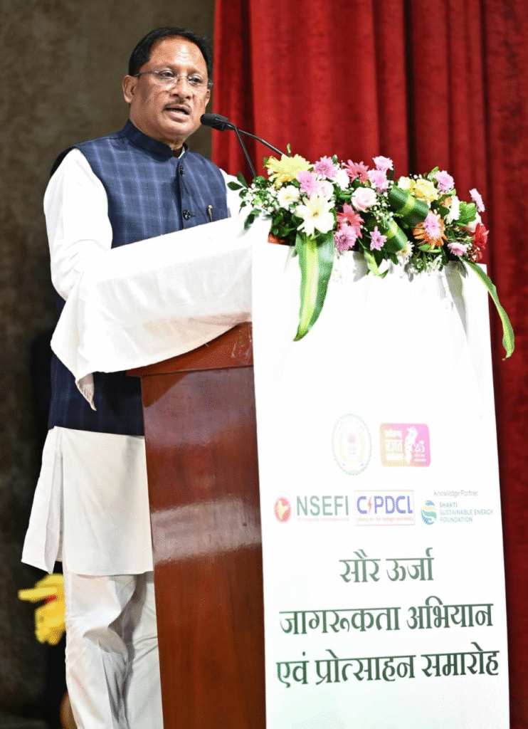 प्रदेश में सौर ऊर्जा के उपभोक्ता अब केवल ऊर्जा उत्पादक ही नहीं, बल्कि ऊर्जा दाता भी बन रहे हैं। पीएम सूर्यघर मुफ्त बिजली योजना जैसी महत्वाकांक्षी पहल के माध्यम से प्रदेश स्वच्छ ऊर्जा के लक्ष्य की प्राप्ति के संकल्प को तीव्र गति से पूर्ण करने की ओर अग्रसर है। मुख्यमंत्री श्री विष्णु देव साय ने आज राजधानी रायपुर स्थित पंडित दीनदयाल उपाध्याय ऑडिटोरियम में आयोजित सौर ऊर्जा जागरूकता और प्रोत्साहन अभियान को संबोधित करते हुए यह बात कही।
