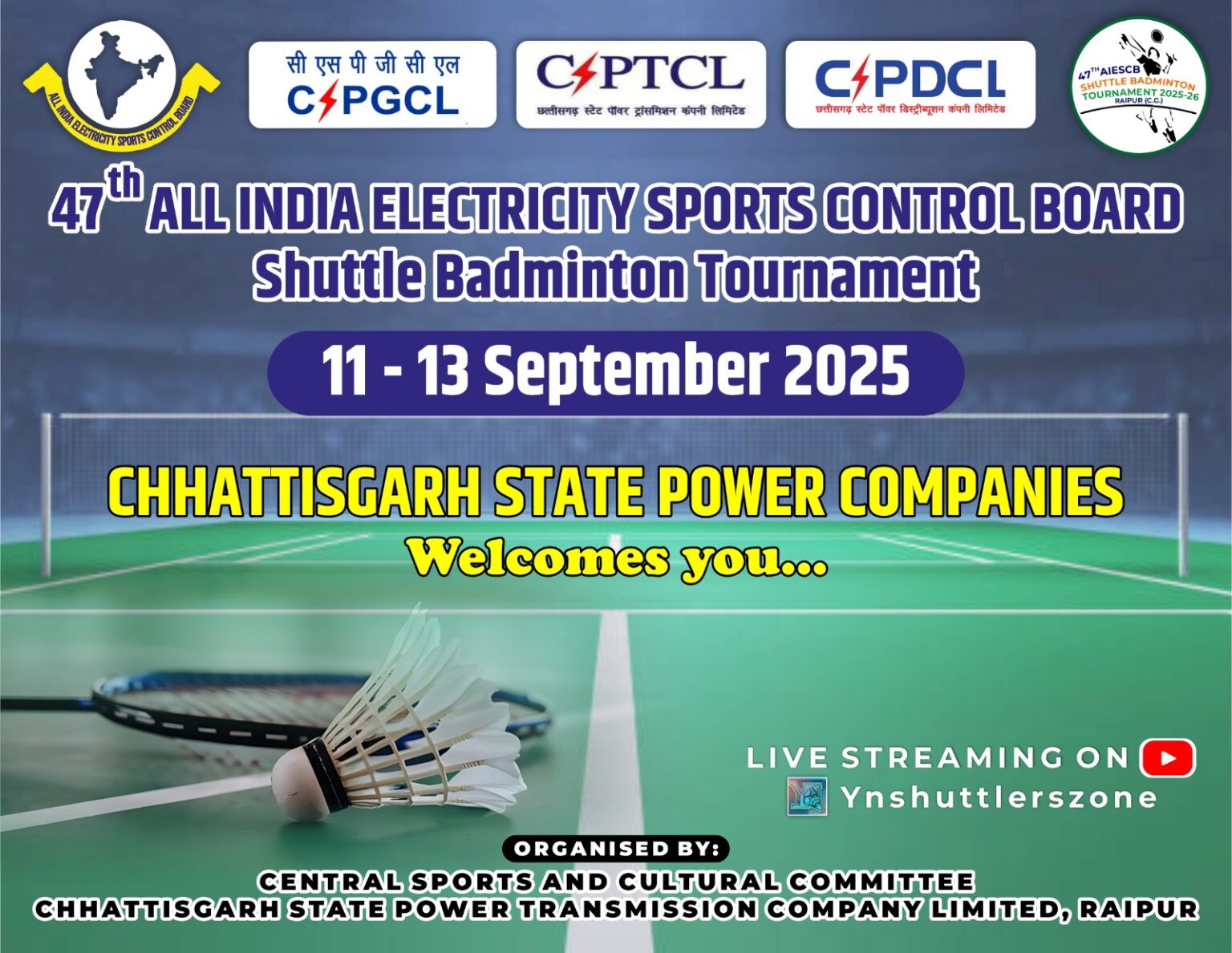 47वीं ऑल इंडिया इलेक्ट्रिसिटी शटल बैडमिंटन टूर्नामेंट का आगाज कल 11 सितंबर को राजधानी में होगा। इसमें 10 राज्यों की पॉवर कंपनियों के खिलाड़ी शामिल होंगे। इसमें लगभग 300 मैच होंगे, जिसमें ओपन सिंगल, ओपन डबल और टीम इवेंट होंगे। इसकी मेजबानी छत्तीसगढ़ स्टेट पॉवर कंपनीज की सेंट्रल स्पोर्ट्स एंड कल्चरल कमेटी कर रही है। स्पर्धा का समापन 13 सितंबर को होगा।