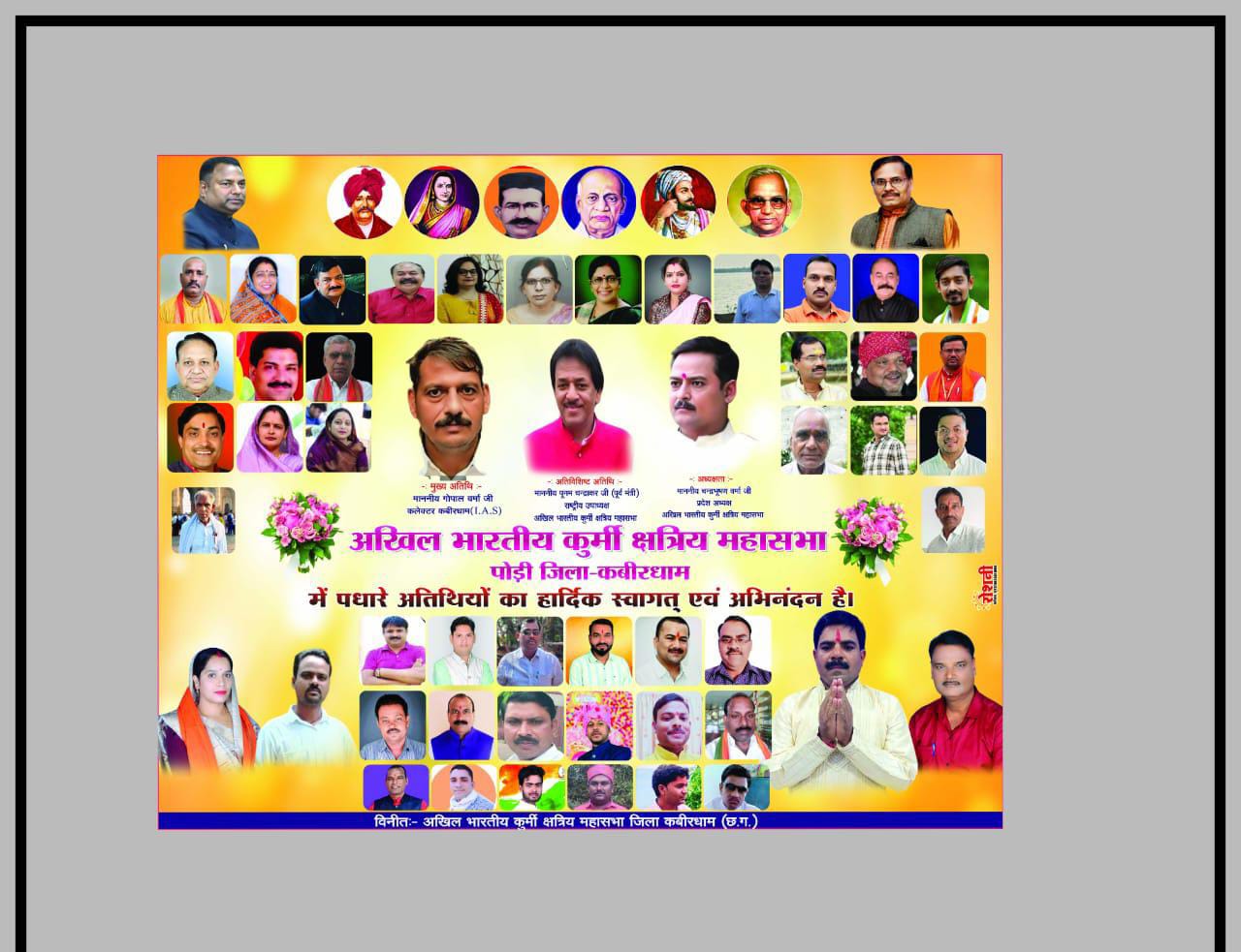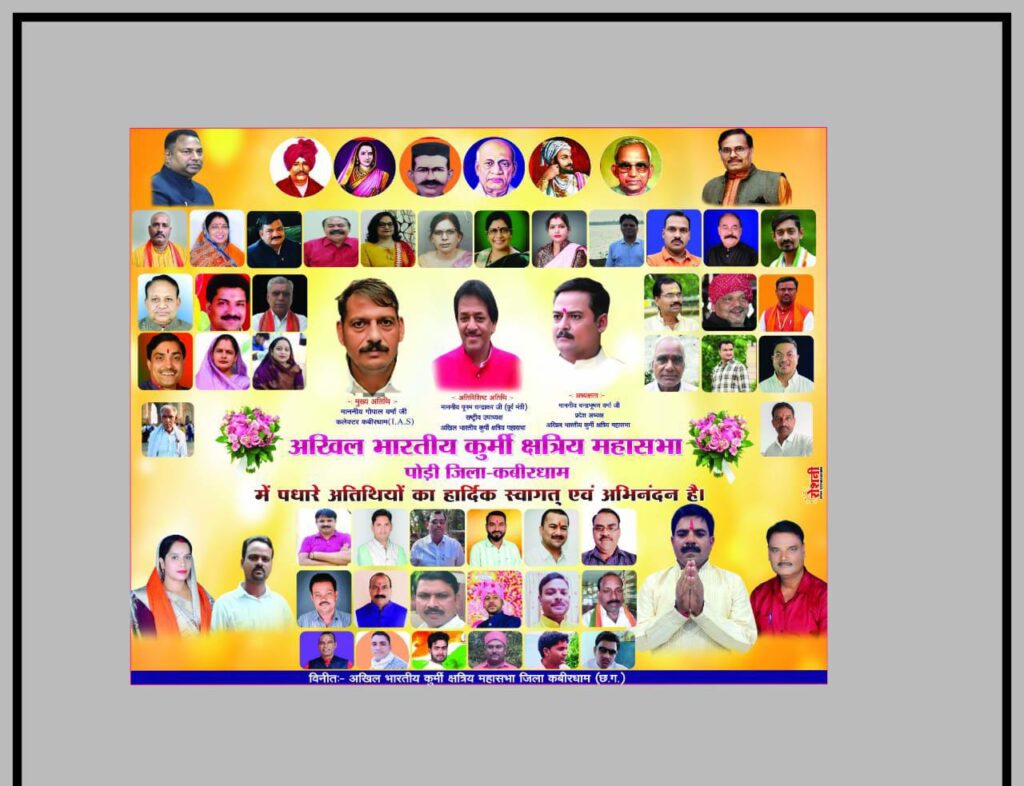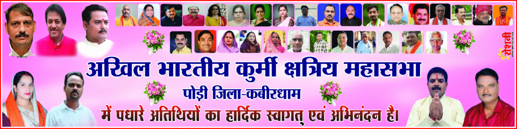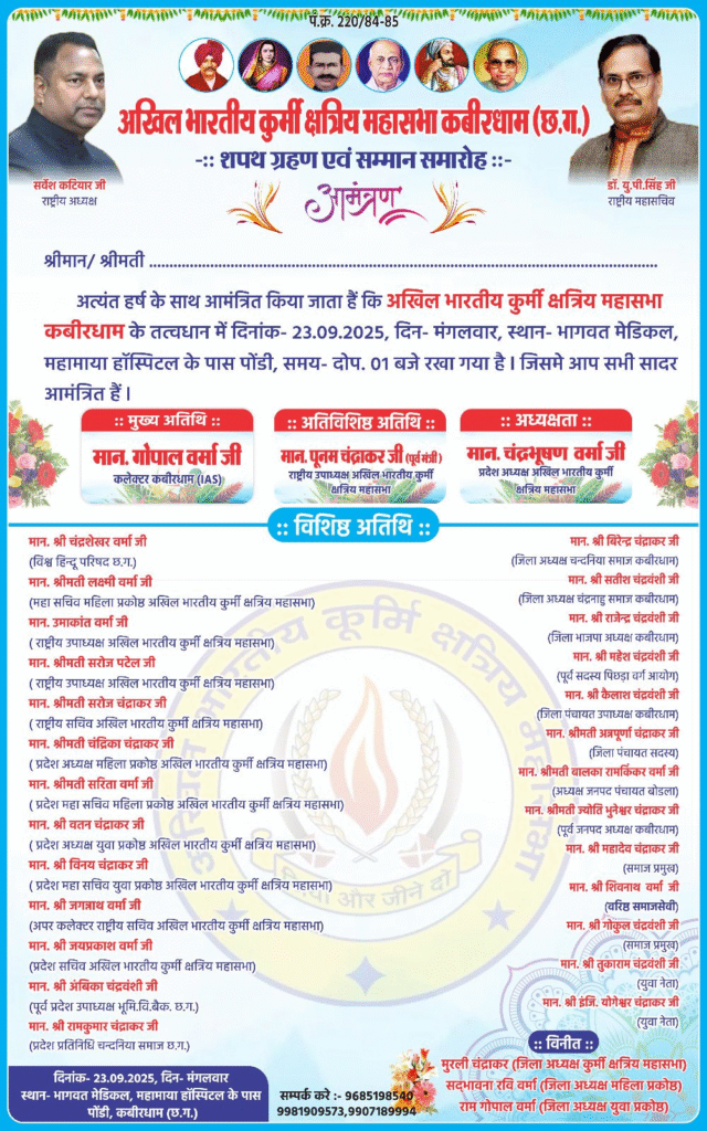 रायपुर। अखिल भारतीय कुर्मी महासभा कबीरधाम के द्वारा शपथ ग्रहण एवं सम्मान समारोह का आयोजन 23 सितंबर दिन मंगलवार स्थान भागवत मेडिकल महामाया मंदिर के पास पोड़ी, कबीरधाम छत्तीसगढ़