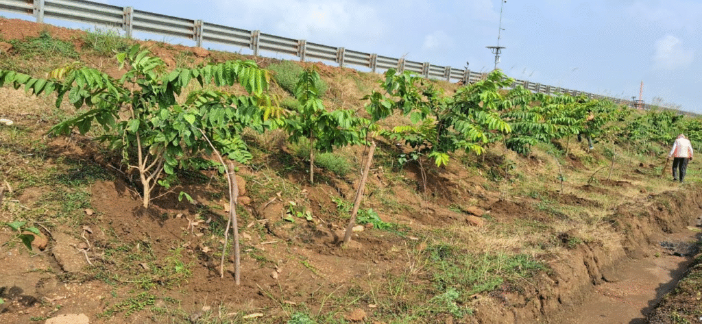 मीडियन प्लांटेशन के तहत डिवाइडर पर पौधे लगाए गए हैं, जबकि सड़क किनारे एवेन्यू प्लांटेशन के रूप में फलदार और छायादार वृक्ष रोपे गए। पिछले वर्षों में क्षतिग्रस्त पौधों को बदलकर हरियाली को जीवित बनाए रखने पर भी विशेष ध्यान दिया गया है।