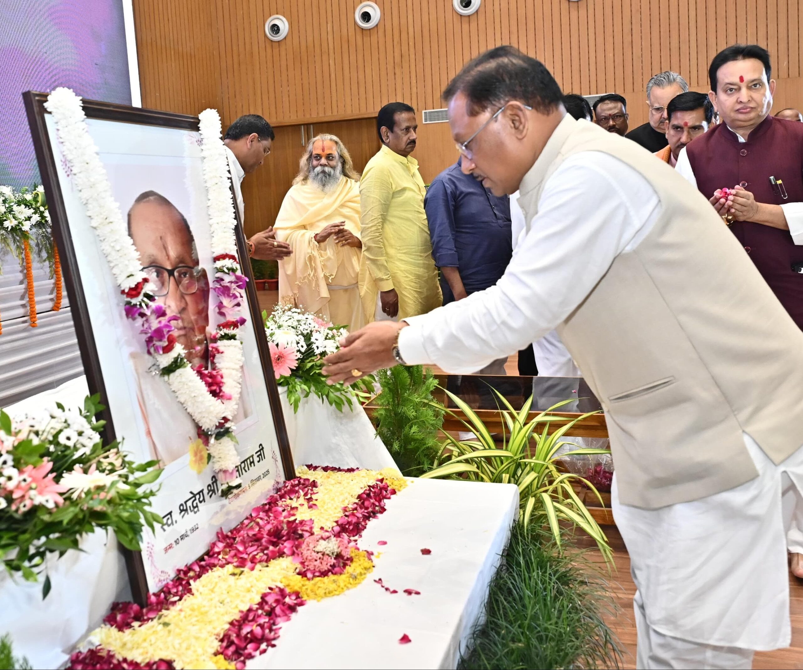 मुख्यमंत्री श्री विष्णुदेव साय राजधानी रायपुर स्थित इंदिरा गांधी कृषि विश्वविद्यालय के सभागार में आयोजित शांता राम सर्राफ जी की श्रद्धांजलि सभा में सम्मिलित हुए। मुख्यमंत्री श्री साय ने शांता राम सर्राफ जी के छायाचित्र पर पुष्पांजलि अर्पित कर उन्हें श्रद्धांजलि दी। उन्होंने ईश्वर से प्रार्थना की कि दिवंगत आत्मा को अपने श्रीचरणों में स्थान दें तथा शोकाकुल परिजनों को दुःख को सहन करने की शक्ति प्रदान करे।