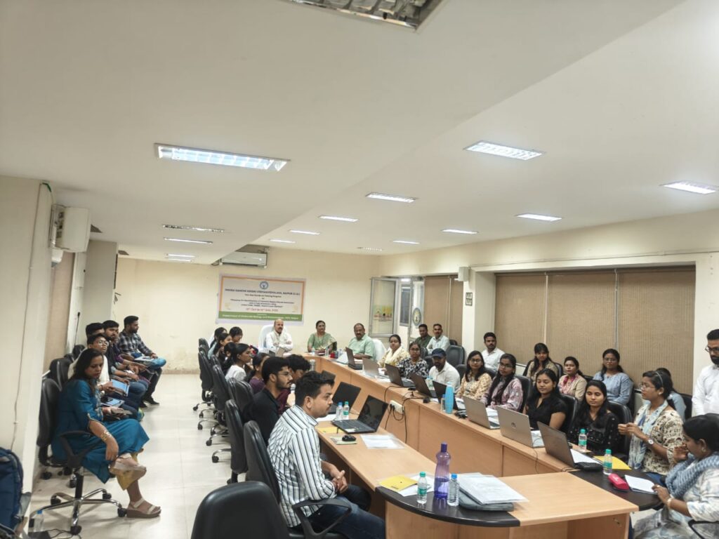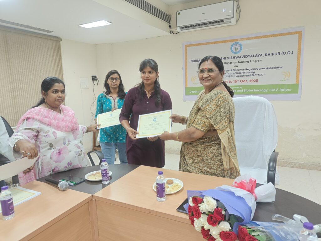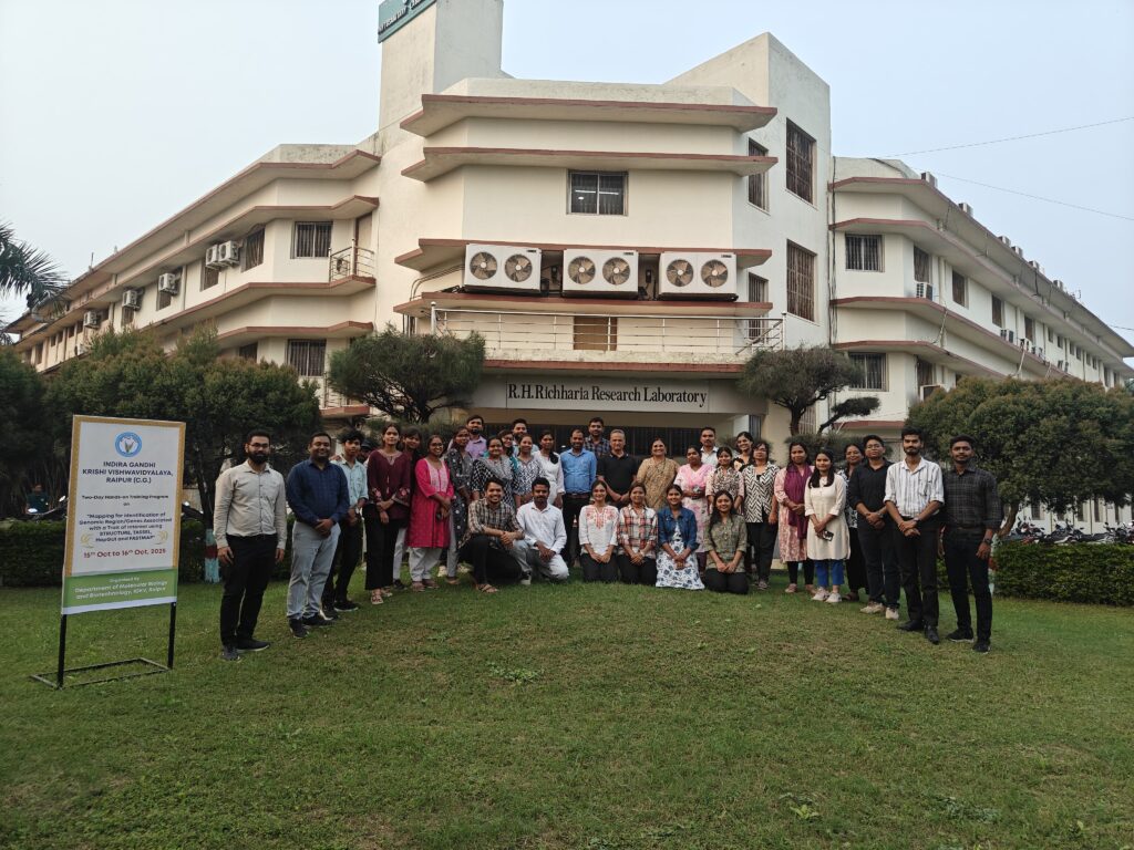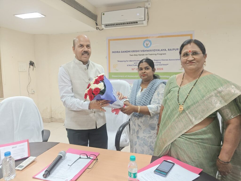“ट्रेट ऑफ इंटरेस्ट से संबद्ध जीनोमिक क्षेत्रों/जीनों की पहचान हेतु STRUCTURE, TASSEL, HapGUI और FASTMAP का उपयोग” विषय पर दो दिवसीय प्रशिक्षण कार्यक्रम का शुभारंभ आज इंदिरा गाँधी कृषि विश्वविद्यालय (आईजीकेवी), रायपुर के आणविक जीवविज्ञान एवं जैव प्रौद्योगिकी विभाग में किया गया। यह कार्यक्रम 15 से 16 अक्टूबर 2025 तक आयोजित किया गया , जिसका उद्देश्य युवा शोधार्थियों, तकनीकी कर्मचारियों एवं विद्यार्थियों को कृषि महत्व के गुणों से संबद्ध जीनों की पहचान हेतु उन्नत जीनोमिक मैपिंग उपकरणों के व्यावहारिक अनुभव एवं सैद्धांतिक समझ से सशक्त बनाना है।