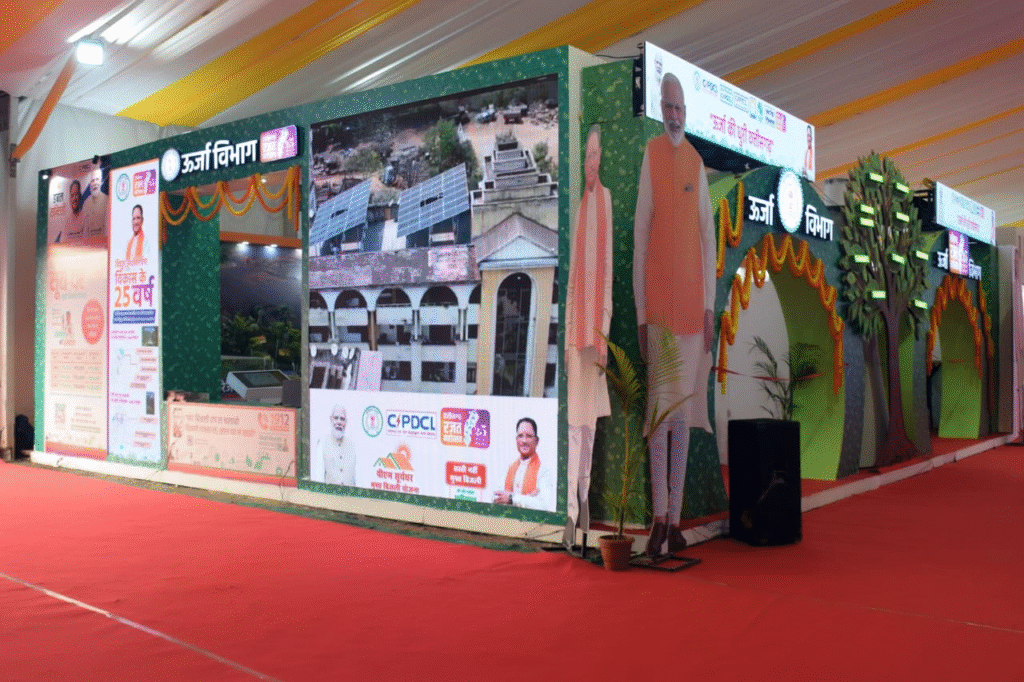 मण्डप के प्रवेश द्वार पर प्रधानमंत्री श्री नरेन्द्र मोदी तथा मुख्यमंत्री श्री विष्णुदेव साय के कट आउट लगे है। ऊर्जा विभाग के मण्डप में ऊर्जा के भावी स्त्रोतों का रोचक चित्रण है। जिसके लिए पम्प स्टोरेज बिजली घर, कंपे्रस्ड बायो गैस, सोलर सिटी, आदर्श सोलर गांव, नियद नेल्लानार तथा विद्युत सुरक्षा संबंधी माॅडल प्रदर्शित किये गये है। प्रधानमंत्री सूर्यघर मुफ्त बिजली योजना की प्रस्तुति काफी रोचक ढंग से की गई है। कठपुतली नृत्य के माध्यम से ‘सुखीराम-दुखीराम‘, ‘पति-पत्नी और वो‘ कहानी की प्रस्तुति की जा रही है जो प्रधानमंत्री सूर्यघर मुफ्त बिजली योजना के बारे में व्यापक जनजागरण कर रही है। क्विज प्रतियोगिता के विजेताओं को क्यू आर कोड इनेबल्ड की-रिंग पुरस्कार स्वरूप प्रदान किये जा रहे हैं। वहीं योजना के लिए स्थल पर पंजीयन कराने वाले उपभोक्ताओं को टी शर्ट प्रदान की जा रही है।