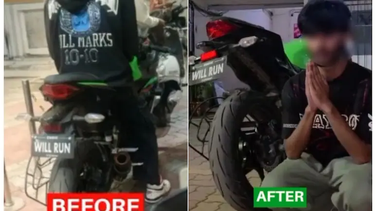 Will Run लिखे नंबर प्लेट वाली बाइक पर घूमने वाले लड़के की हिमाकत तो देखो पहले तो फैंसी नंबर प्लेट और फिर पुलिस को एक्स पर टैग कर चैलेंज दिया, ‘ कैच मी इफ यू कैन’. फिर क्या था पुणे पुलिस लग गई उसे ढूढने. पुलिस ने उसके चैलेंज को स्वीकर किया और आखिरकार 1 घंटे में उसे ढूंढ निकाला. पुलिस के हत्थे चढ़ते ही लड़के की सारी हेकड़ी निकल गई.