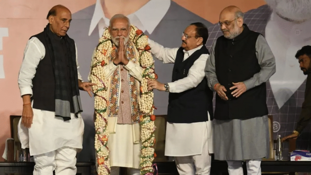 बिहार में बीजेपी और एनडीए की बंपर जीत लेकर पीएम मोदी के आने से पहले ही दिल्ली में बीजेपी मुख्यालय पर जबरदस्त जोश का माहौल दिखा। पीएम मोदी जब बीजेपी अध्यक्ष जेपी नड्डा के साथ वहां पहुंचे तो उन्होंने गमछा लहराकर प्रचंड जीत के जोश का इजहार किया। पीएम मोदी को गमछा हिलाते देख वहां मौजूद कई लोग भी गमछा हिलाते नजर आए।मोदी ने बिहार की जनता को धन्यवाद दिया और इस जीत को बिहार के विकास के लिए बताया। यह जीत भाजपा के लिए मनोबल बढ़ाने वाली है।