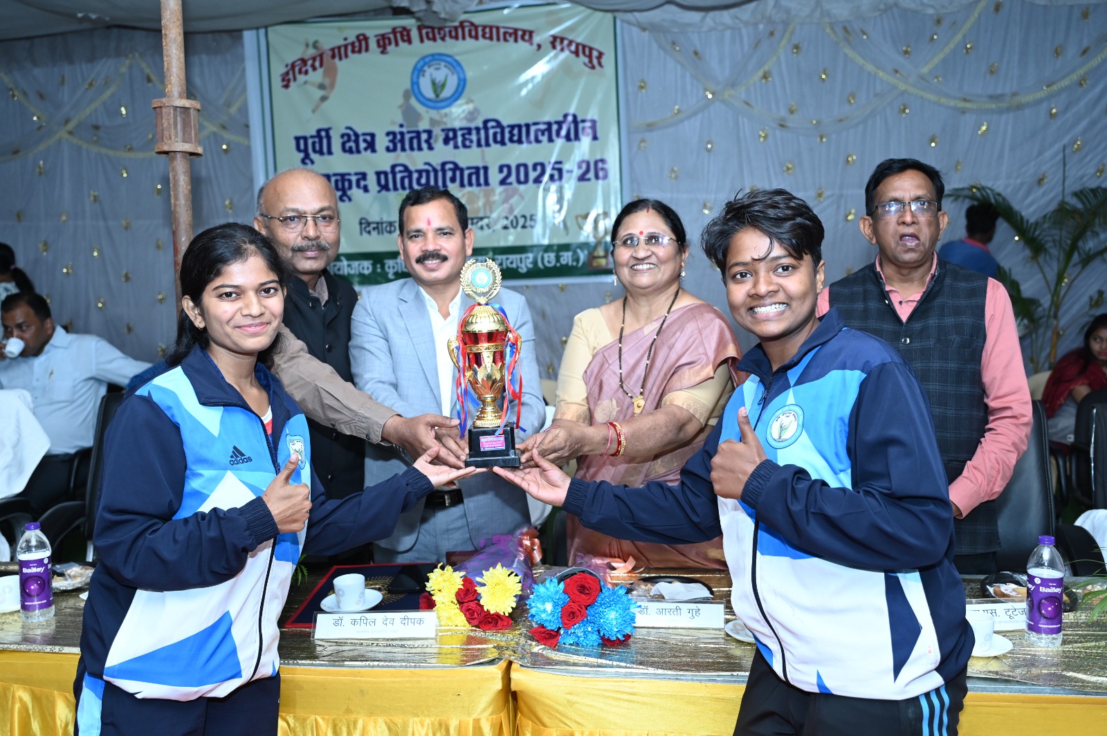 रायपुर। इंदिरा गांधी कृषि विश्वविद्यालय, रायपुर में 19 से 21 नवम्बर 2025 तक आयोजित पूर्व क्षेत्रीय अंतर महाविद्यालयीन खेल-कूद प्रतियोगिता का समापन एवं पुरस्कार वितरण समारोह का आयोजन आज कृषि महाविद्यालय, रायपुर के स्पार्ट्स काॅम्पलैक्स में किया गया। इस अंतर महाविद्यालयीन खेल-कूद प्रतियोगिता में इंदिरा गांधी कृषि विश्वविद्यालय के अंतर्गत संचालित पूर्व जोन के 8 महाविद्यालयों के लगभग 250 छात्र-छात्राओं ने भाग लिया। पूर्व क्षेत्रीय अंतर महाविद्यालयीन खेल-कूद प्रतियोगिता के समापन अवसर पर मुख्य अतिथि इंदिरा गांधी कृषि विश्वविद्यालय के कुलसचिव डाॅ. कपिल देव दीपक थे।