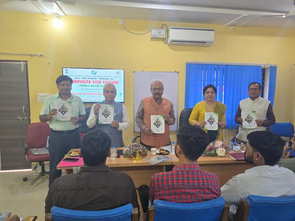 इंदिरा गांधी कृषि विश्वविद्यालय, कृषि विज्ञान केन्द्र, रायपुर के द्वारा तीन दिवसीय ’मिश्रित मत्स्य पालन’ विषय पर प्रशिक्षण आज समापन हुआ। यह प्रशिक्षण राष्ट्रीय मात्स्यिकी विकास बोर्ड, हैदराबाद द्वारा प्रायोजित किया गया। इस प्रशिक्षण में छत्तीसगढ़ राज्य के अलग- अलग जिलों से कुल 25 प्रशिक्षणर्थियों ने सक्रिय रूप से भाग लिया।इस प्रशिक्षण के उद्घाटन समारोह में मुख्य अतिथि के रूप में डॉ. अजय कुमार वर्मा, अधिष्ठाता, स्वामी विवेकानंद कॉलेज ऑफ एग्रीकल्चरल इंजीनियरिंग एवं टेक्नोलॉजी, इं.गां.कृ.वि. उपस्थित थे। इस कार्यक्रम में कृषि विज्ञान केन्द्र, रायपुर के वरिष्ठ वैज्ञानिक एवं प्रमुख डॉ. गौतम रॉय ने अपने उदबोधन में कृषि विज्ञान केन्द्र, रायपुर में चल रही मछली पालन की विभिन्न गतिविधियों के बारे में विस्तार से अवगत कराया।