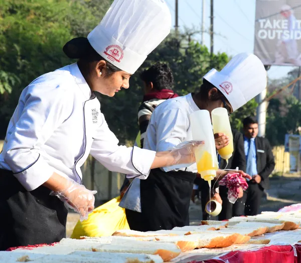 शहर के शाहपुरा इलाके में आईएचएम के छात्रों ने सड़क पर 269.9 फीट लंबे और 8 इंच चौड़े सैंडविच को महज 10 मिनट के भीतर बनाकर तैयार किया है। इस रिकार्ड को बनता देख शहरभर से हजारों की संख्या में लोग इकट्ठे हुए। इस दौरान सैंडविच तैयार करने वाले छात्र भी खासा उत्साह में दिखाई दिए।