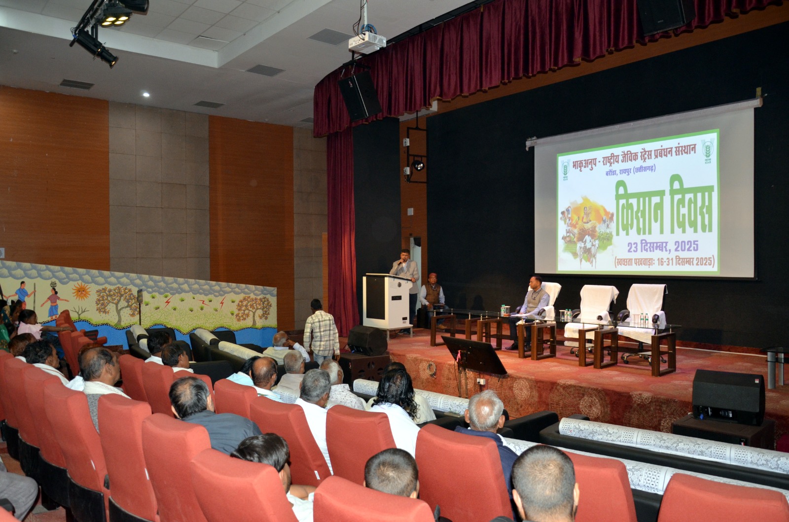 भाकृअनुप–राष्ट्रीय जैविक तनाव प्रबंधन संस्थान (ICAR-NIBSM), रायपुर ने आज किसान दिवस (राष्ट्रीय किसान दिवस) के अवसर पर एक व्यापक कार्यक्रम का आयोजन किया। इस कार्यक्रम का मुख्य उद्देश्य किसान संवाद, जागरूकता सृजन और स्वच्छ कृषि पद्धतियों को बढ़ावा देना था। भारत रत्न चौधरी चरण सिंह, भारत के पूर्व प्रधानमंत्री की जयंती के उपलक्ष्य में आयोजित यह कार्यक्रम वैज्ञानिक नवाचारों और धरातलीय कार्यान्वयन के बीच की कड़ी को मजबूत करने के लिए एक महत्वपूर्ण मंच के रूप में सामने आया। सभा को संबोधित करते हुए भाकृअनुप-एनआईबीएसएम के निदेशक डॉ. पी. के. राय ने चौधरी चरण सिंह जी को भावभीनी श्रद्धांजलि अर्पित की और जोर देकर कहा कि किसान समुदाय के प्रति समर्पण और सेवा के मूल्य ही संस्थान के मिशन का आधार हैं।