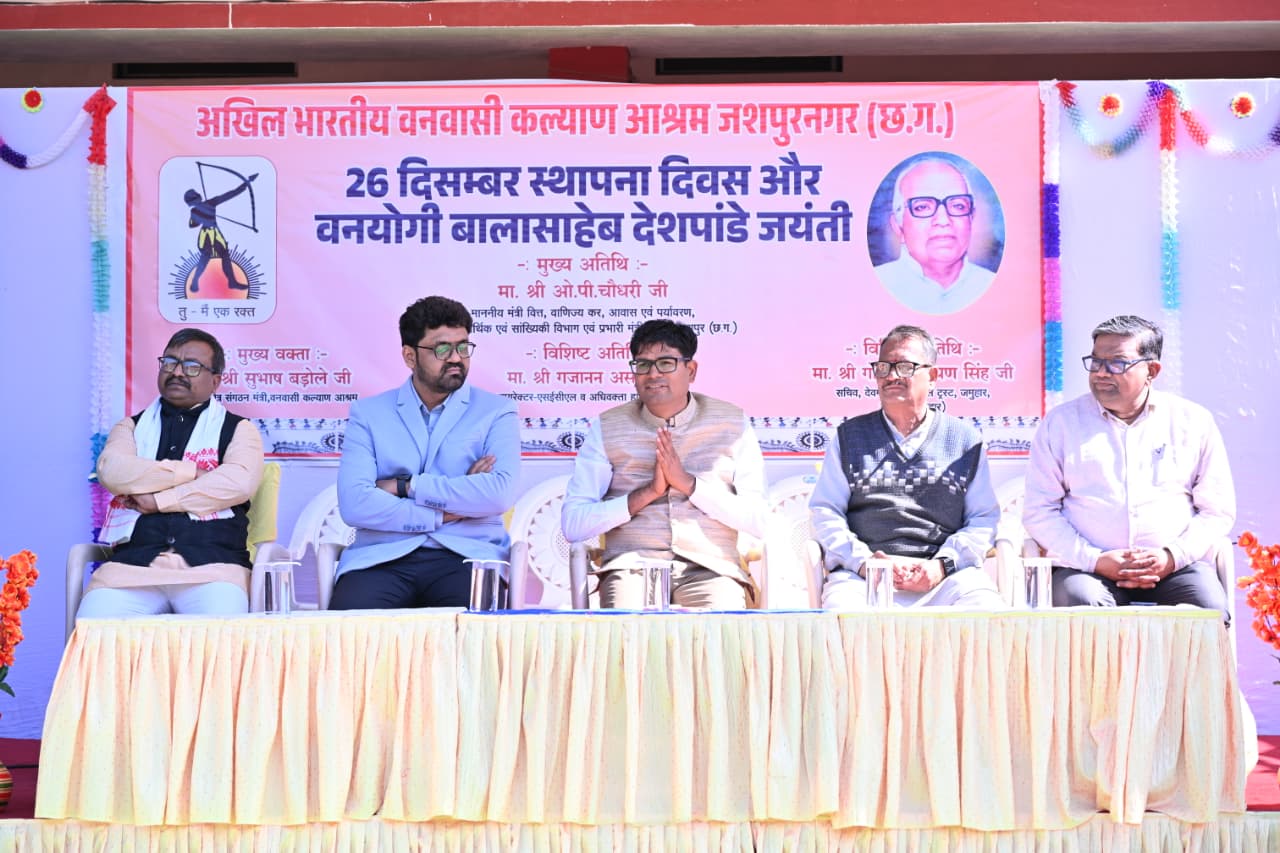 रायपुर- अखिल भारतीय वनवासी कल्याण आश्रम के 73वें स्थापना दिवस एवं संस्थापक बाला साहब देशपांडे की जयंती के अवसर पर आज कल्याण आश्रम विद्यालय परिसर में वार्षिकोत्सव एवं स्थापना दिवस समारोह का भव्य आयोजन किया गया। कार्यक्रम में मुख्य अतिथि के रूप में वित्त मंत्री श्री ओ.पी. चौधरी तथा विशिष्ट अतिथि नागपुर हाईकोर्ट के अधिवक्ता श्री गजानन असोले एवं देवमंगल मेमोरियल ट्रस्ट के सचिव श्री गोविंद नारायण सिंह उपस्थित रहे।