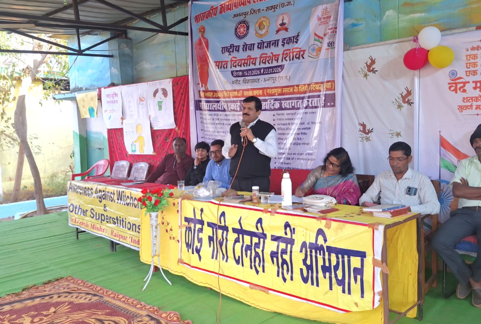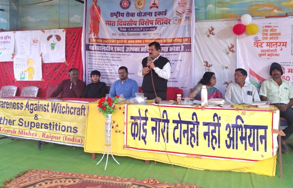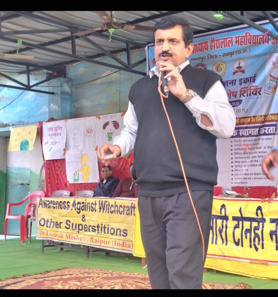 अभनपुर थनौद में व्याख्यान -अंधश्रद्धा निर्मूलन समिति के अध्यक्ष व नेत्र विशेषज्ञ डॉ. दिनेश मिश्र ने अभनपुर थनौद,में ग्रामीणों एवम शासकीय काव्योपाध्याय हीरालाल महाविद्यालय के छात्रों को संबोधित करते हुए कहा देश में अंधविश्वास और सामाजिक कुरीतियों के कारण अक्सर अनेक निर्दोष लोगों को प्रताड़ना का शिकार होना पड़ता है,जिससे निदान के लिए आम जन में वैज्ञानिक दृष्टिकोण के विकास की अत्यंत आवश्यकता है.