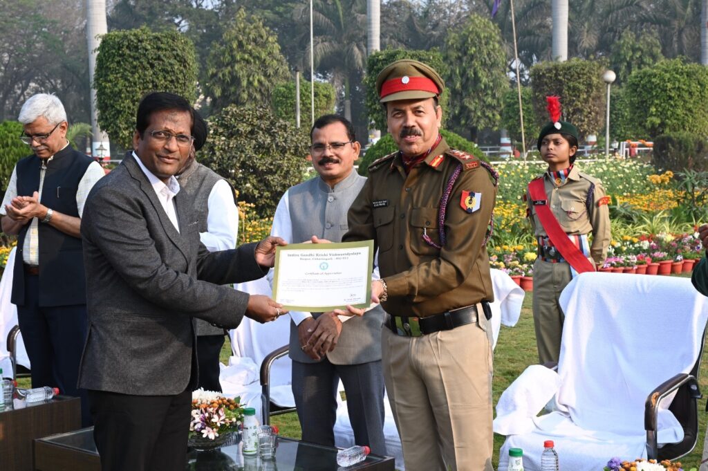 रायपुर- देश के 77वें गणतंत्र दिवस के अवसर पर कुलपति डॉ. गिरीश चंदेल ने कृषि महाविद्यालय, रायपुर में विश्वविद्यालय स्तरीय गणतंत्र दिवस समारोह में तिरंगा फहराया एवं परेड की सलामी ली। 77वें गणतंत्र दिवस समारोह को संबोधित करते हुए उन्होंने कहा कि इंदिरा गांधी कृषि विश्वविद्यालय, रायपुर प्रदेेश का एक मात्र विश्वविद्यालय है जिसे शिक्षा मंत्रालय, भारत सरकार द्वारा राष्ट्रीय संस्थागत रैंकिंग फ्रेमवर्क (NIRF) में कृषि एवं संबंधित क्षेत्रों के अंतर्गत 28वीं रैंक प्रदान किया गया है जो विश्वविद्यालय के लिए गौरव की बात है।