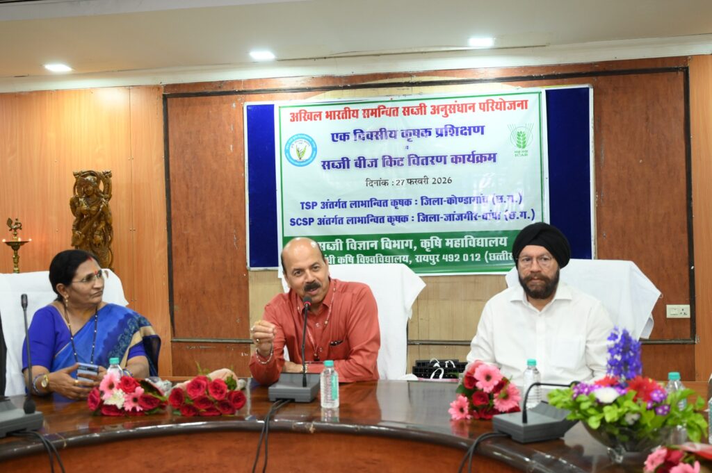 रायपुर– कृषि महाविद्यालय, इंदिरा गांधी कृषि विश्वविद्यालय, रायपुर के सब्जी विज्ञान विभाग में अखिल भारतीय समन्वित सब्जी अनुसंधान परियोजना के अनुसूचित जनजाति उप योजना (कोंडागांव) एवं अनुसूचित जाति उप योजना (जांजगीर चांपा) के अंतर्गत लाभान्वित कृषकों के लिए एक दिवसीय प्रशिक्षण एवं सब्जी बीज वितरण कार्यक्रम का सफल आयोजन किया गया। कार्यक्रम का शुभारंभ मां सरस्वती के समक्ष दीप प्रज्वलन कर किया गया। तत्पश्चात कार्यक्रम के मुख्य अतिथि, कुलपति, इंदिरा गांधी कृषि विश्वविद्यालय, डॉ. गिरीश चंदेल, निदेशक विस्तार सेवाएं, डॉ. एस.एस. टुटेजा, अधिष्ठाता, कृषि महाविद्यालय, रायपुर, डॉ. आरती गुहे का पुष्पगुच्छ भेंट कर स्वागत किया गया।