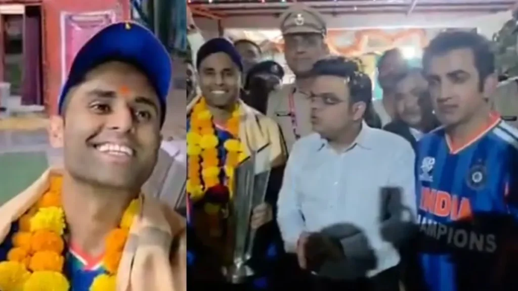 टी20 वर्ल्ड कप 2026 जीतने के कुछ ही घंटों बाद कप्तान सूर्यकुमार यादव, कोच गौतम गंभीर और आईसीसी चेयरमैन जय शाह ट्रॉफी लेकर अहमदाबाद के हनुमान टेकरी मंदिर पहुंचे. यहां उन्होंने भगवान हनुमान के दर्शन कर टीम की ऐतिहासिक जीत के लिए आशीर्वाद लिया. इस दौरान मंदिर परिसर में सुरक्षा के पुख्ता इंतजाम किए गए थे.