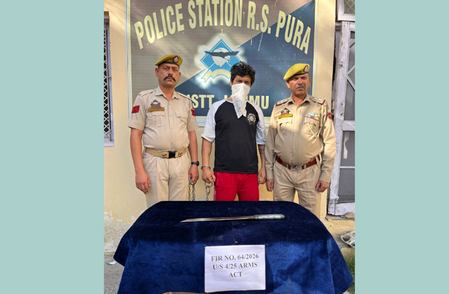 आरोपी ने अपनी पहचान दविंदर कुमार उर्फ राहुल, पुत्र दर्शन लाल, निवासी चक मोहम्मद यार, तहसील R.S. पुरा, जिला जम्मू के रूप में बताई। तलाशी के दौरान, अधिकारियों ने उसके कब्जे से एक धारदार हथियार (टोका) बरामद किया। आरोपी पर FIR संख्या 64/2026 के तहत शस्त्र अधिनियम (Arms Act) की धारा 4/25 के तहत मामला दर्ज कर लिया गया है, और आगे के किसी भी संभावित जुड़ाव या आपराधिक गतिविधियों का पता लगाने के लिए जांच जारी है।