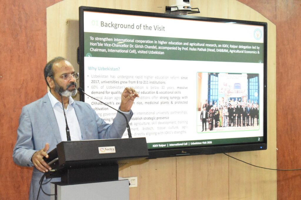 रायपुर, इंदिरा गांधी कृषि विश्वविद्यालय, रायपुर में उज़्बेकिस्तान यात्रा के प्रमुख निष्कर्षों को साझा करने एवं अंतरराष्ट्रीय शैक्षणिक अवसरों को बढ़ावा देने के उद्देश्य से संगोष्ठी का आयोजन किया गया। यह कार्यक्रम विश्वविद्यालय के अंतरराष्ट्रीय शैक्षणिक सहयोग को सुदृढ़ करने के सतत प्रयासों का हिस्सा है।