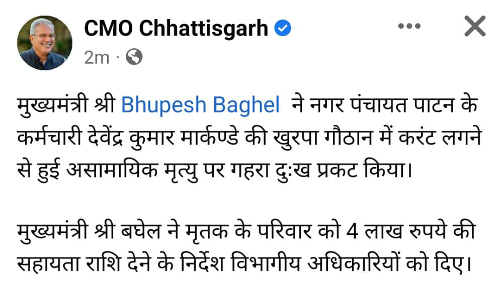 रायपुर। मुख्यमंत्री भूपेश बघेल ने नगर पंचायत पाटन के कर्मचारी देवेन्द्र कुमार मार्कण्डे की खुरपा गौठान में करंट लगने से हुई असामायिक मृत्यु पर गहरा दुख प्रकट किया। मुख्यमंत्री श्री बघेल ने मृतक के परिवार को 4 लाख रुपये की सहायता राशि देने के निर्देश विभागीय अधिकारियों को दिये है।