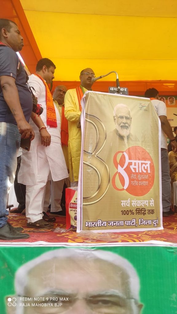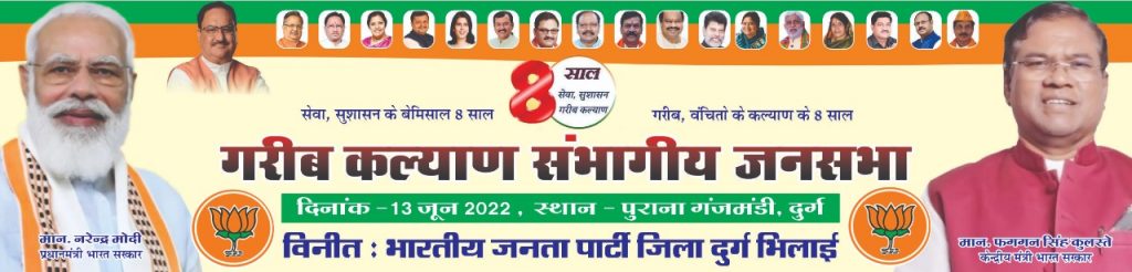 भारतीय जनता पार्टी ने केंद्र की नरेंद्र मोदी सरकार के 8 वर्ष पूर्ण होने के अवसर पर दुर्ग में आयोजित गरीब कल्याण संभागीय जनसभा का आयोजन किया। इस आयोजन में मुख्य अतिथि केंद्रीय इस्पात एवं ग्रामीण विकास राज्यमंत्री फग्गन सिंह कुलस्ते एवं अति विशिष्ट अतिथि के रूप में सांसद सरोज पाण्डेय, सांसद विजय बघेल, सांसद संतोष पाण्डेय, पूर्व विधानसभा अध्यक्ष प्रेम प्रकाश पाण्डेय, विधायक विद्यारतन भसीन सहित संभाग के सभी जिलों के जिला अध्यक्ष और पूर्व विधायक उपस्थित रहे।