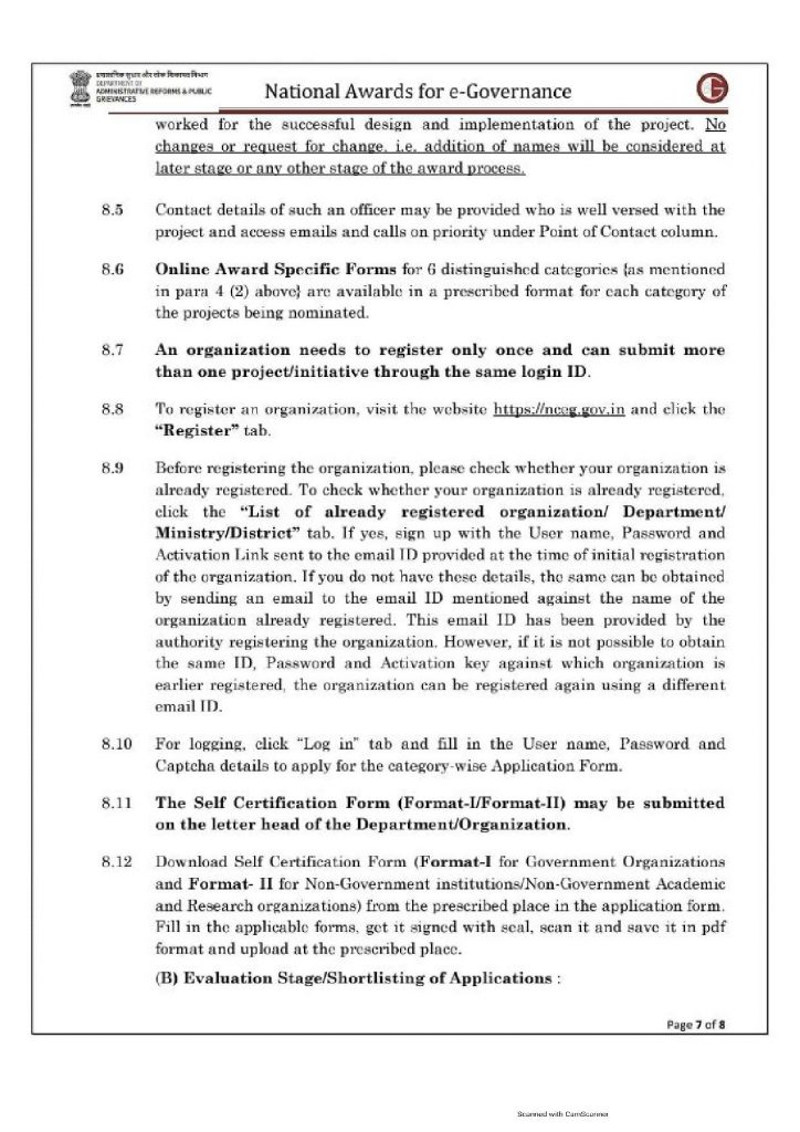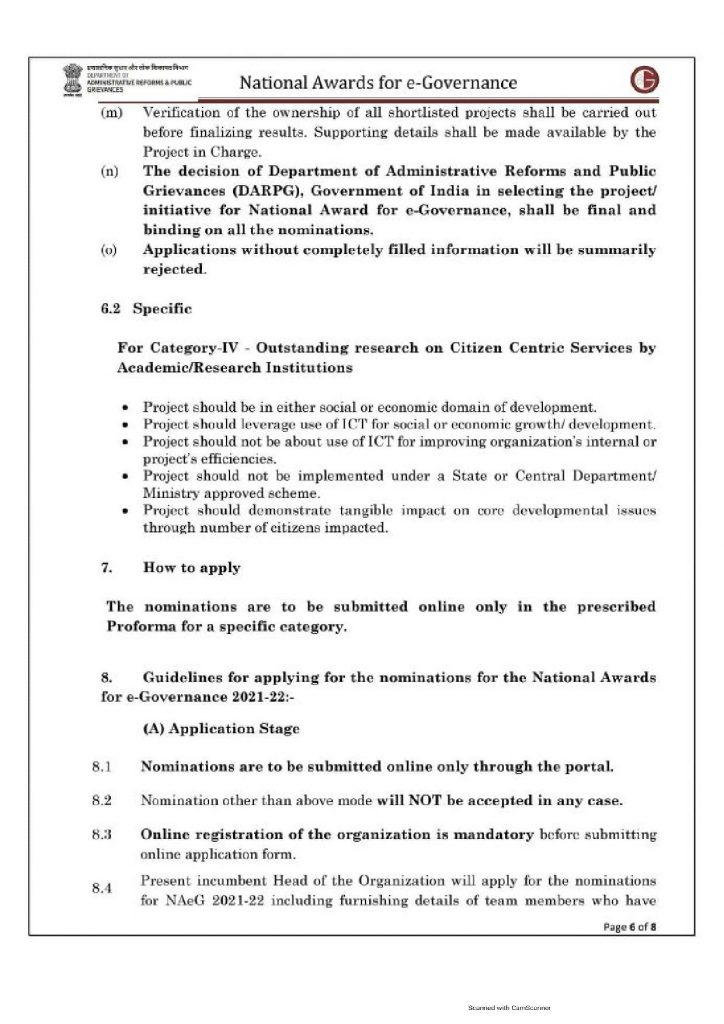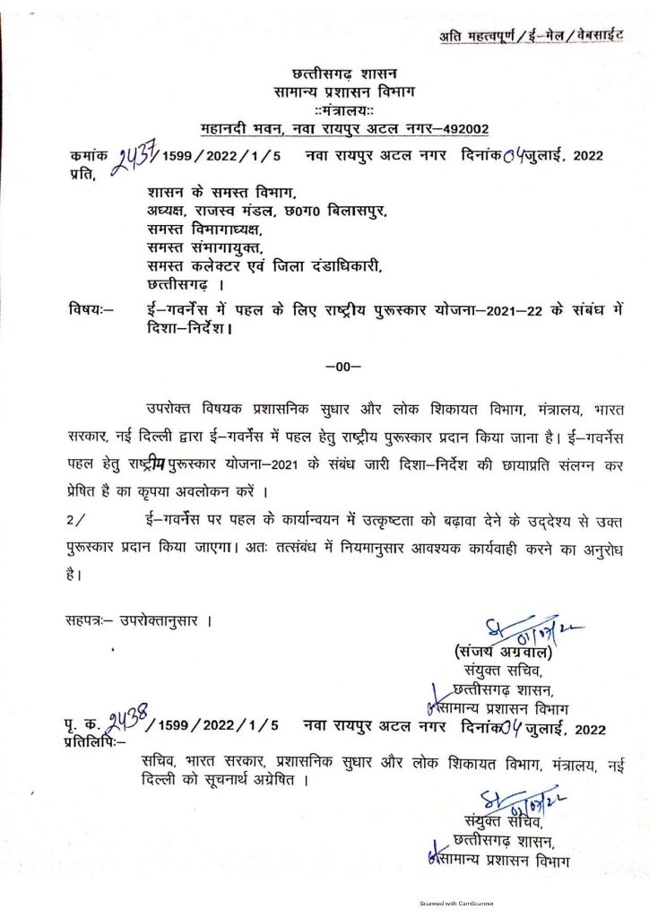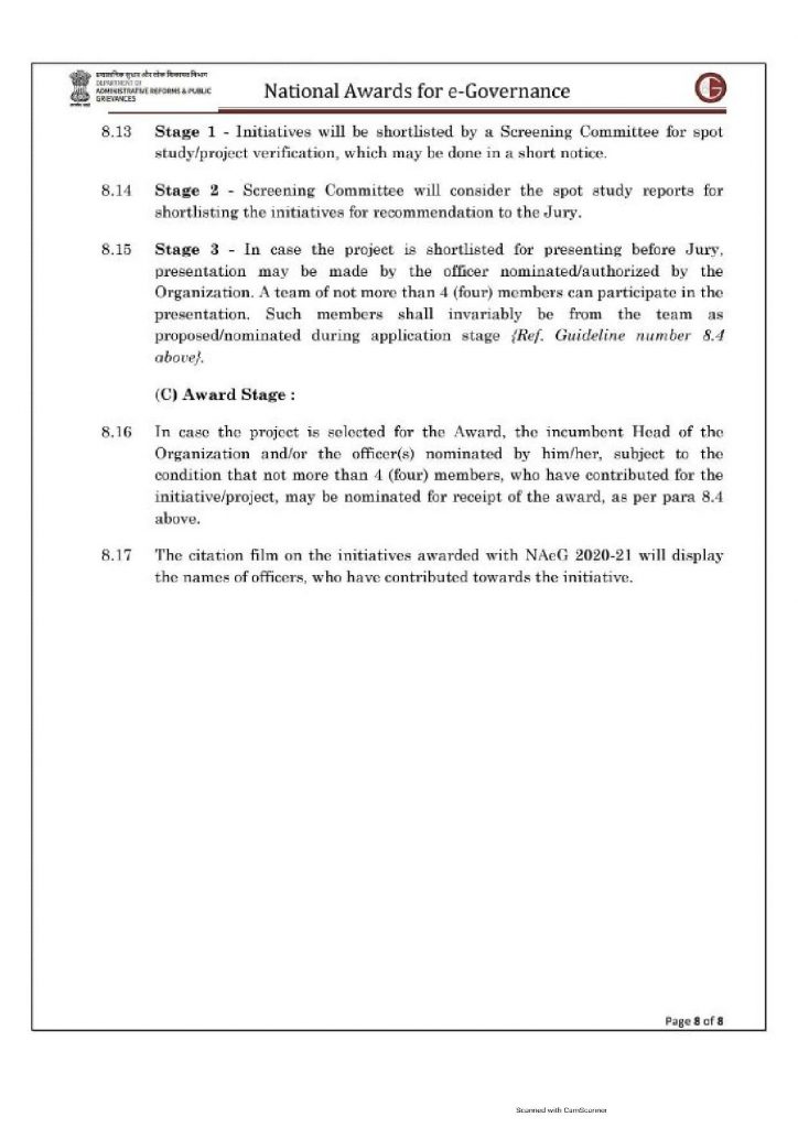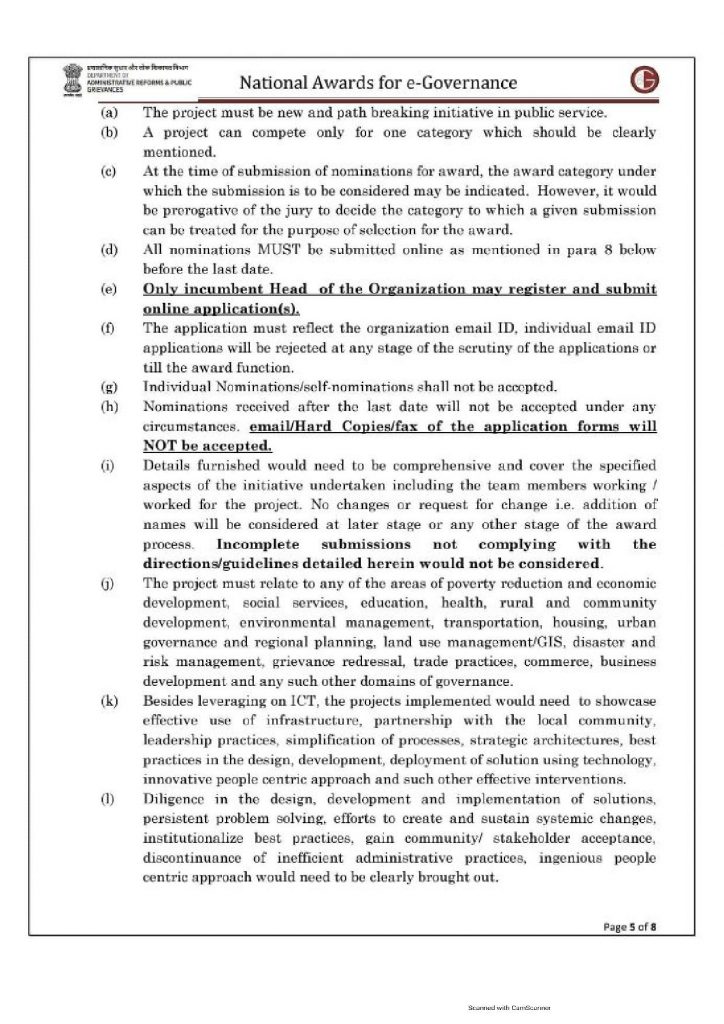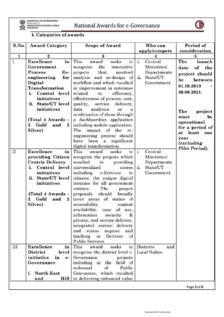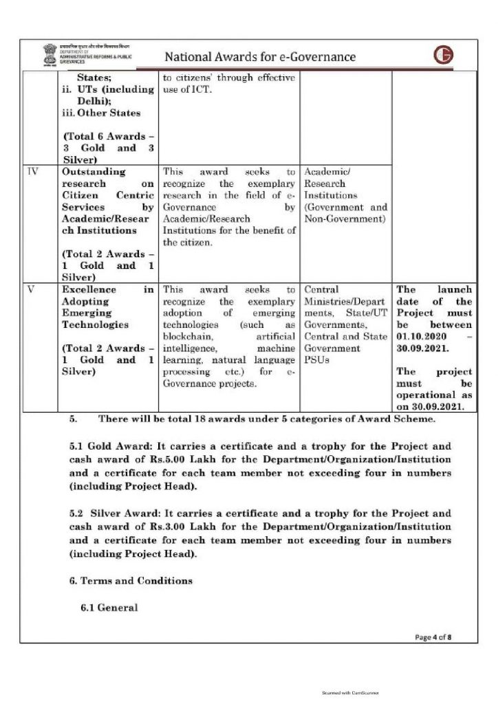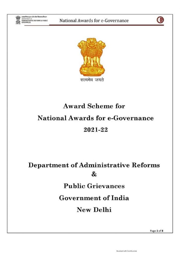 ई-गवर्नेस में पहल के लिए राष्ट्रीय पुरस्कार योजना 2020-2021 के संबंध में दिशा-निर्देश जारी किया गया है। प्रशासनिक सुधार और लोक शिकायत विभाग मंत्रालय भारत सरकार नई दिल्ली द्वारा ई-गवर्नेस में पहल के लिए राष्ट्रीय पुरस्कार प्रदान किया जाना है। ई-गवर्नेस पर पहल के कार्यान्वयन में उत्कृष्टता को बढ़ावा देने के उद्देश्य से उक्त पुरस्कार प्रदान किया जाएगा।