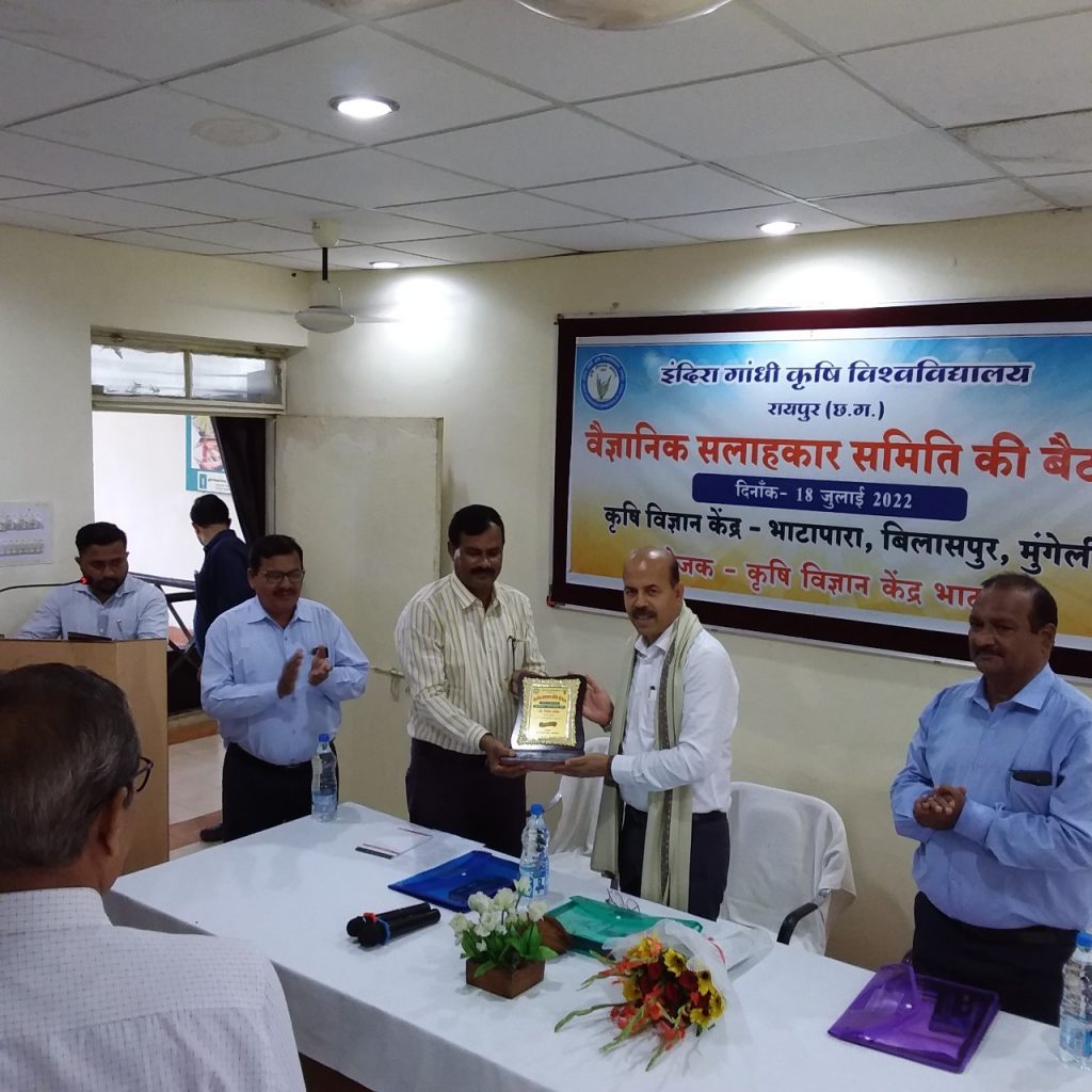 बैठक के दौरान कुलपति डॉ. गिरीश चंदेल ने कृषि विज्ञान केन्द्रों के काम-काज को सुदृढ़ करने के लिए आवश्यक सुझाव दिये एवं वरिष्ठ वैज्ञानिकों को कार्ययोजना बनाने के लिए आव्हान किया। उन्होंने कृषि विज्ञान केन्द्र के माध्यम से छोटे और सीमांत किसानों की आय बढ़ाने के लिए कृषि की नवीन तकनीकों को बढ़ावा देने हेतु निर्देशित किया। डॉ. चंदेल ने किसानों की आय को दोगुनी करने के लिए कृषि विज्ञान केन्द्रों को खाद्य प्रसंस्करण, मूल्यसंवर्धन एवं निर्मित उत्पादों के विपणन हेतु किसानों को आवश्यक बाजार उपलब्ध कराने पर जोर दिया। इस अवसर पर डॉ. चंदेल ने कृषि विज्ञान केन्द्र भाटापारा में नवनिर्मित सोयाबीन प्रसंस्करण इकाई का उद्घाटन किया गया। उन्होंने कृषि विज्ञान केन्द्रों द्वारा किये जा रहे कार्यों की सराहना की और कृषि विज्ञान केन्द्रोें को महिला स्व-सहायता समूहों एवं किसान उत्पादक संगठन के लिए इन्क्यूबेशन सेन्टर के रूप में कार्य करने की सलाह दी। इस अवसर पर कृषि विज्ञान केन्द्रों के वरिष्ठ वैज्ञानिक एवं विषय वस्तु विशेषज्ञ उपस्थित थे।