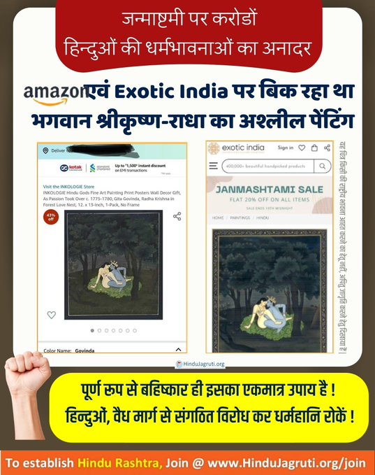 ई-कॉमर्स वेबसाइट amazon इंडिया और Exotic इंडिया एक बार फिर विवादों में है. इस बार यह विवाद एक पेंटिंग को लेकर पैदा हुआ. इस पेंटिंग में भगवान कृष्ण को बेहद ही आपत्तिजनक और अश्लील मुद्रा में दिखाया गया है.
