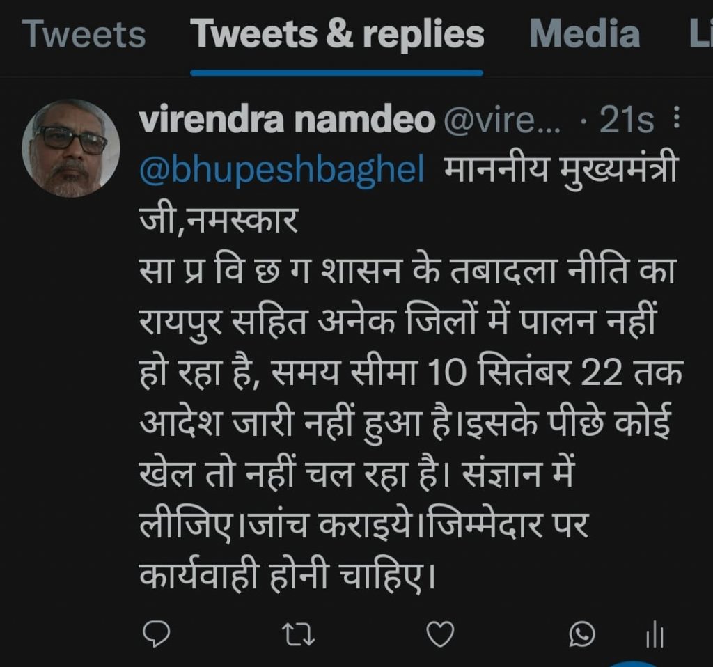 मुख्यमंत्री भूपेश बघेल को ट्वीट कर जांच कर विलम्ब के लिये जिम्मेदार लोगों पर कार्यवाही की मांग