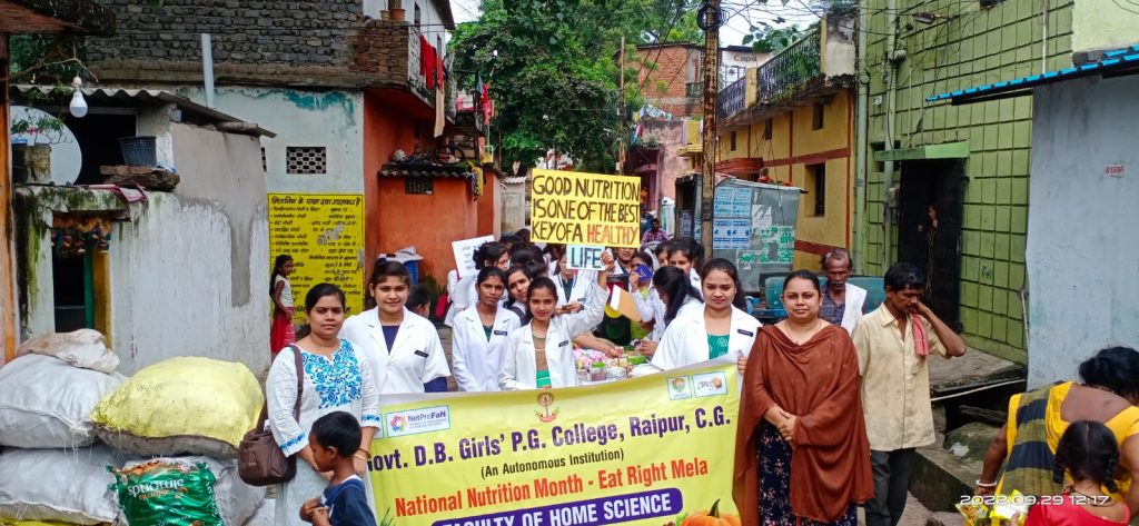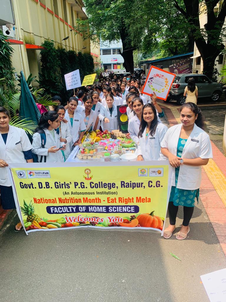 रैली में छात्राओं साथ कार्यक्रम प्रभारी डॉ वासु वर्मा एवं डॉ अभया जोगलेकर एवं अतिथि व्याख्याता ने सहभाग किया। पोषण पर आधारित नारे लगाते हुए पोषण व्हील नेहरू नगर के आँगनबाड़ी पर समाप्त हुई। गृह विज्ञान विभाग के समस्त छात्राओं ने उत्साह पूर्वक भाग लिया। कु- मुस्कान लालवानी एवं समूह ने ट्रेफिक सिग्नल, फ़ूड पिरामिड के माध्यम से पोषण की जानकारी आंगनबाड़ी के कार्यकर्ताओ को प्रदान की। छात्राओं ने हर घर पोषण – देश रोशन एवं सब्जी, सलाद खाओ हर बार, जैसे नारो के माध्यम से लोगो को जागरूक किया। उक्त कार्यक्रम में गर्भवती, धात्री स्त्री को फल तथा बच्चो को पौष्टिक खाद्य का वितरण किया गया। कोदो से बना केक आकर्षण का केंद्र था। गुड़ चने के साथ बच्चो को अलसी भी वितरण किया। एम. एस. सी. एवं स्नातक छात्राओं ने उत्साह पूर्वक भाग लिया। उक्त कार्यक्रम डॉ- वासु वर्मा एवं डॉ- अभया जोगलेकर के मार्गदर्शन में संपन्न हुआ।