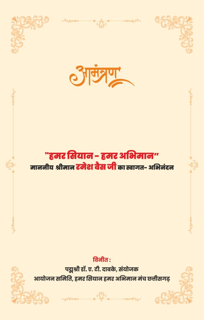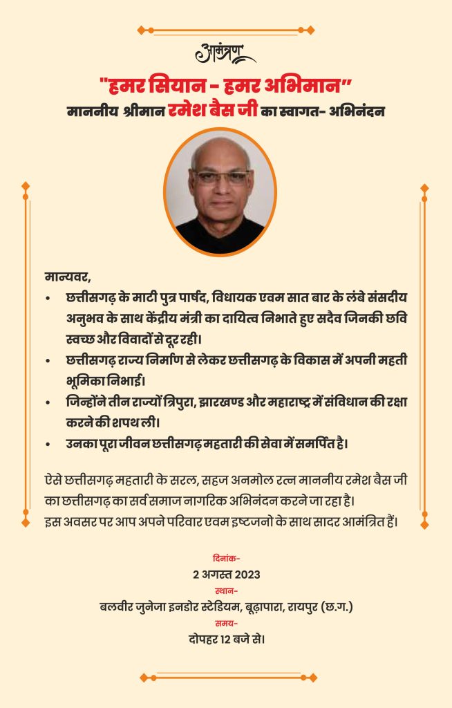 महाराष्ट्र के राज्यपाल और छत्तीसगढ़ के माटीपुत्र रमेश बैस का 2 अगस्त को स्वागत और अभिनंदन किया जाएगा। यह आयोजन हमर सियान – हमर अभिमान मंच छत्तीसगढ़ के संयोजक पद्मश्री ए.टी. दाबके की ओर से किया जाएगा। समारोह का आयोजन बुढ़ापारा स्थित बलबीर जुनेजा इंडोर स्टेडियम रायपुर में दोपहर 12.00 बजे होगा। छत्तीसगढ़ के माटीपुत्र रमेश बैस ने अपने राजनीति सफर की शुरूआत बतौर पार्षद के रूप में की थी। इसके बाद वे लगातार अपनी सक्रियता दिखाते हुए राजनीति के क्षेत्र में काफी सफल हुए। वे 7 बार सांसद रहे। इसके बाद महामहिम राज्यपाल के पद पर अपनी जिम्मेदारियों का सफलतापूर्वक निर्वहन किया। वे सर्वप्रथम त्रिपुरा के, उसके बाद झारखंड और वर्तमान में वे महाराष्ट्र के राज्यपाल हैं।